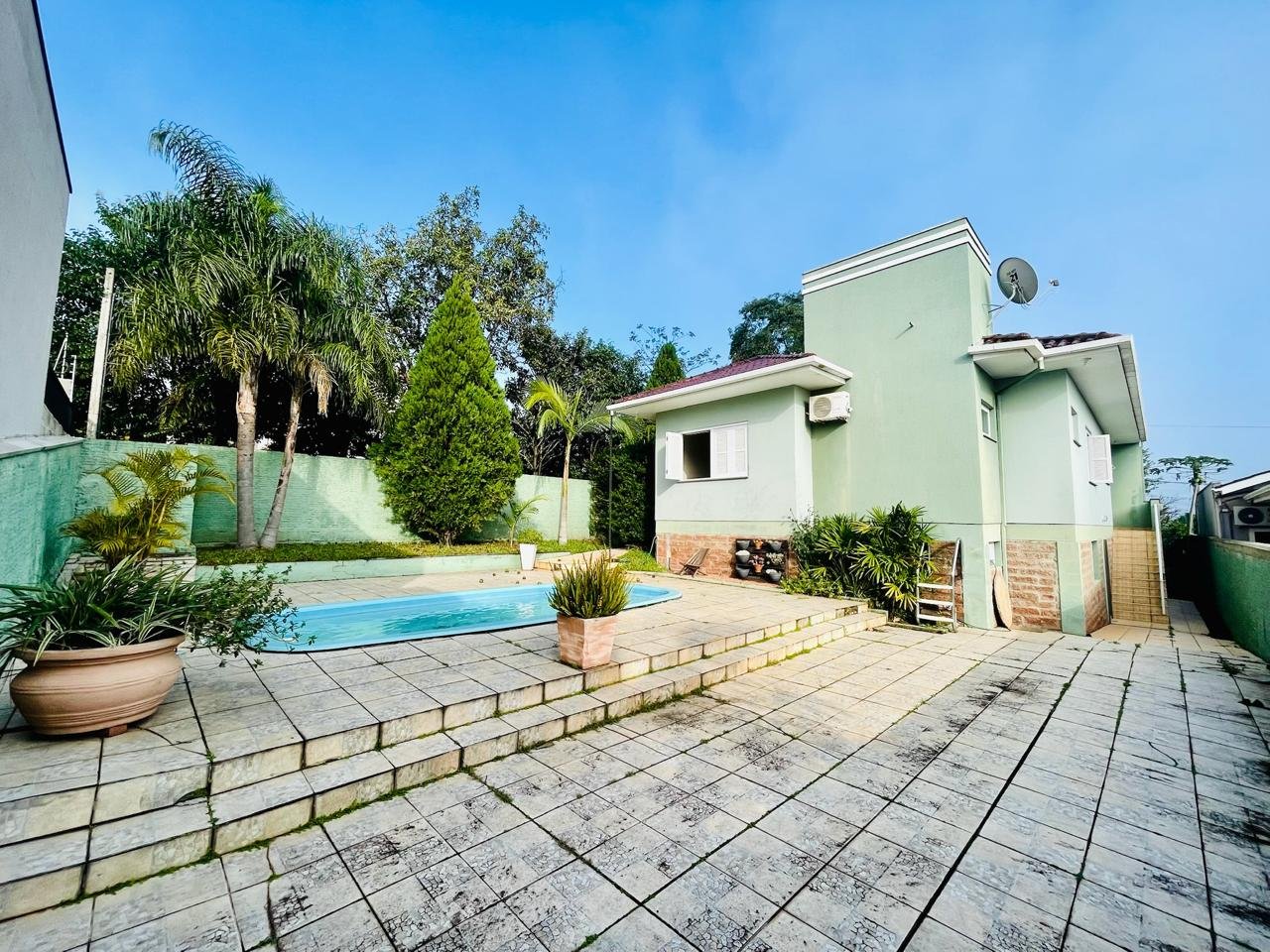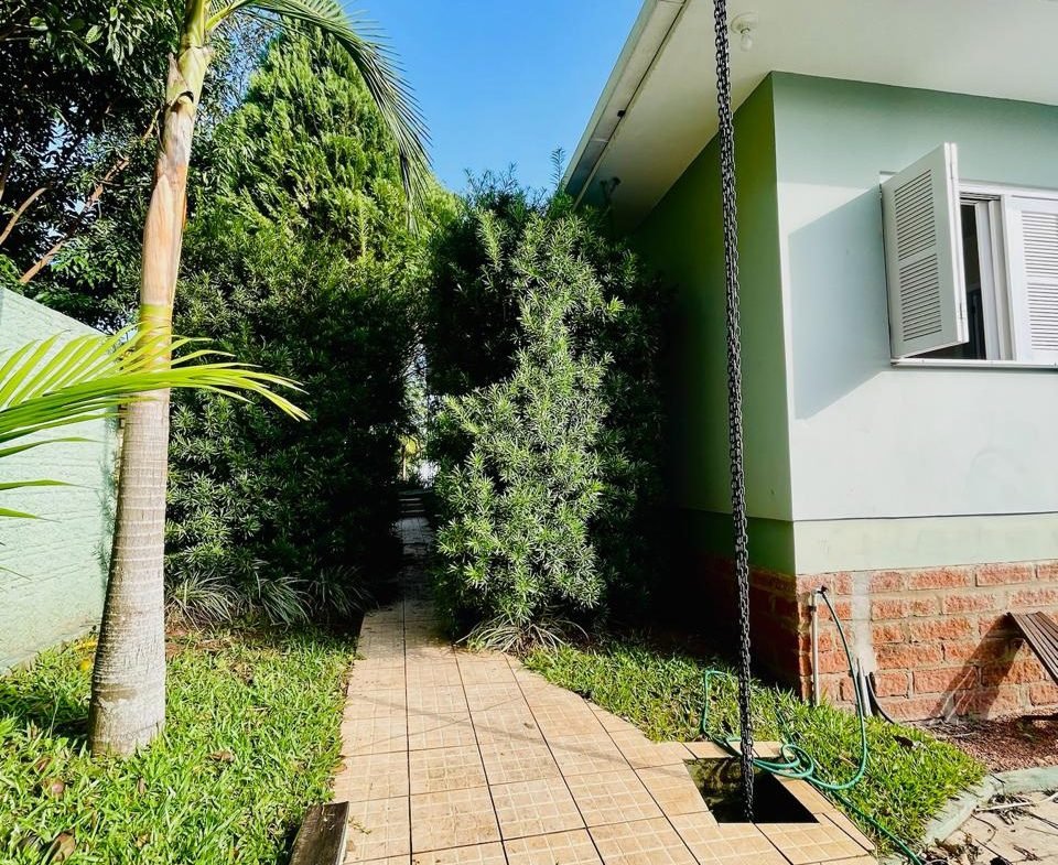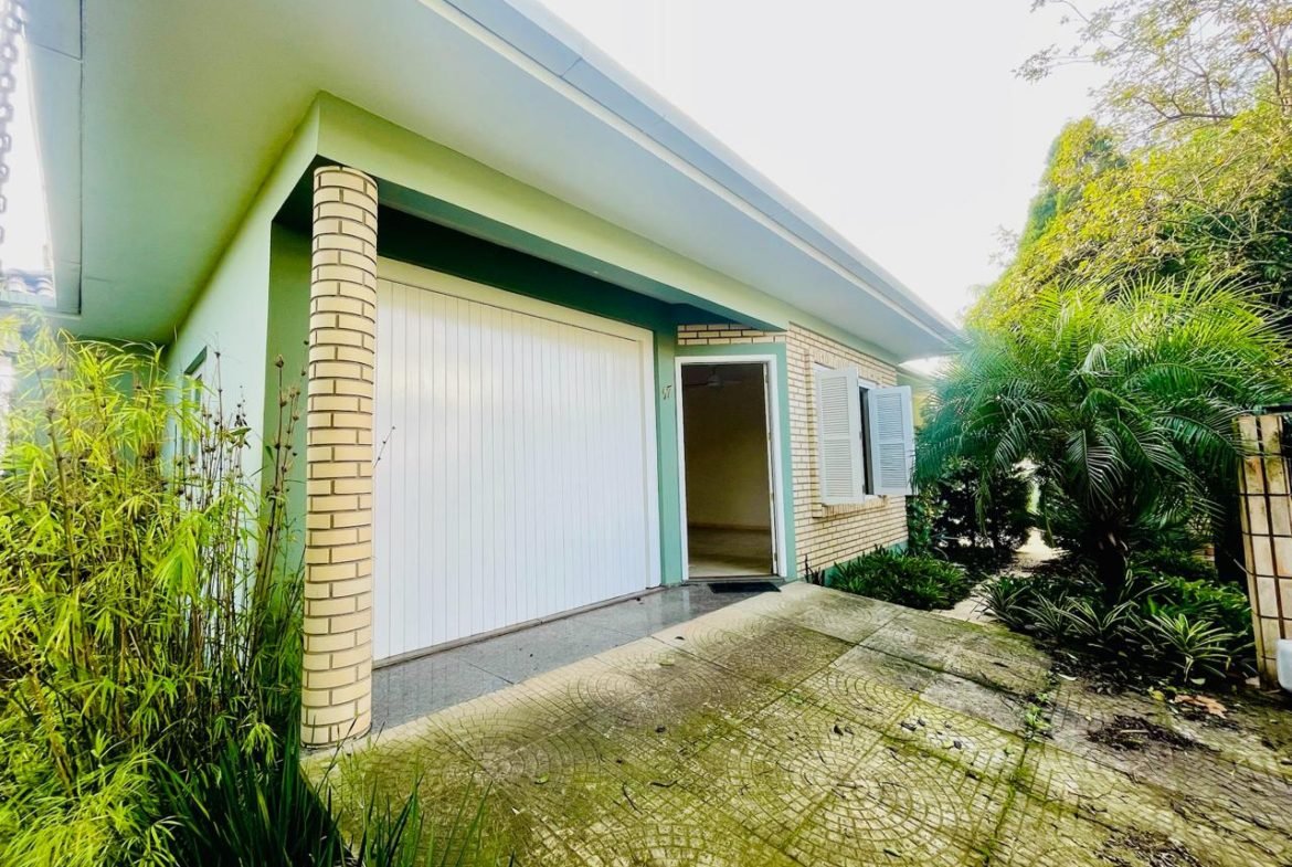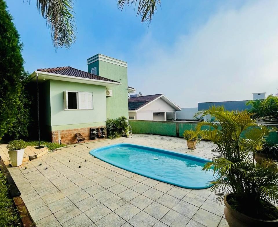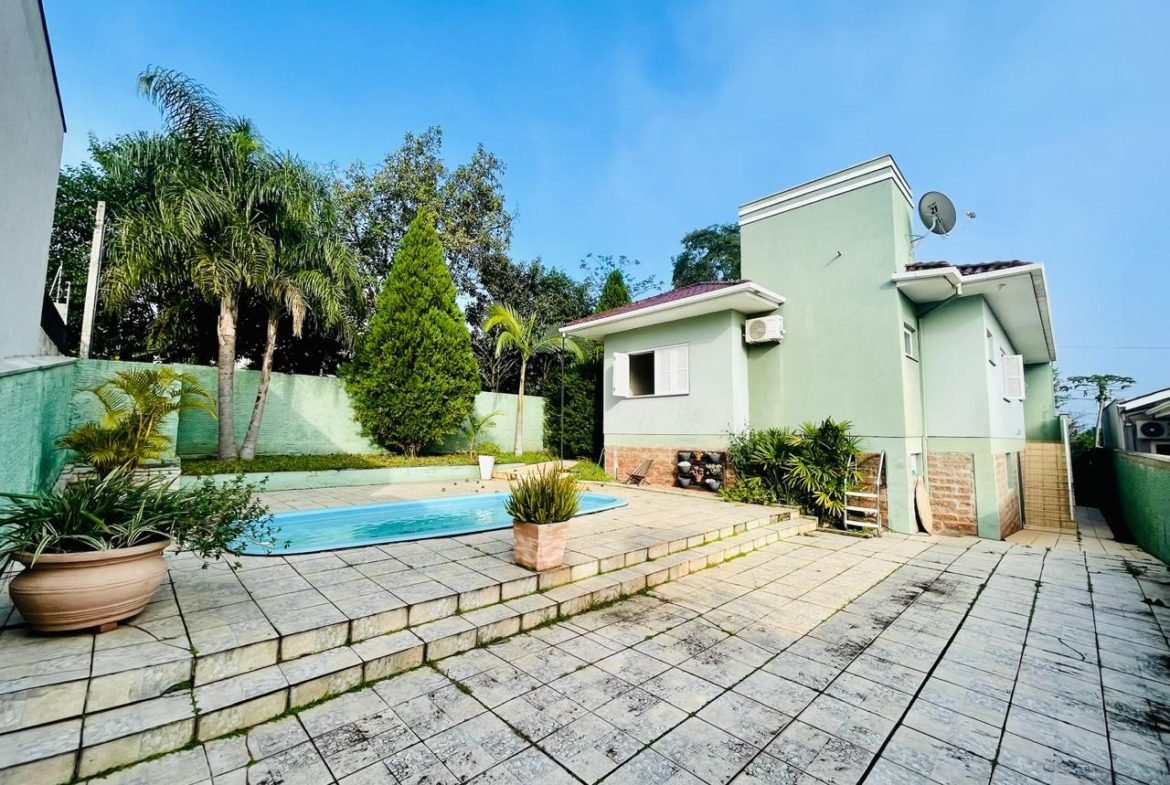 Casa com 03 dormitórios, um sendo suíte, sala, cozinha, 02 banheiros, área de serviço e garagem para 01 carro, quintal com churrasqueira e piscina. Escritura.